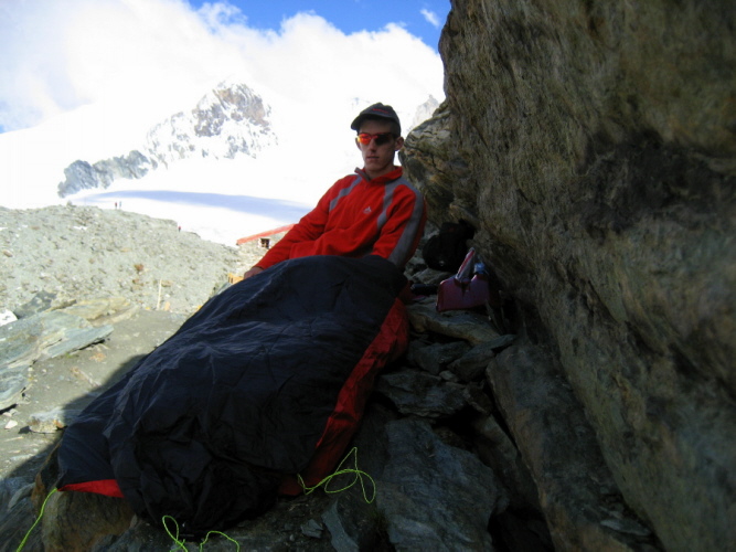 08/2009: Nach der Besteigung des Mont Blanc (4810 m) über den Bossesgrat; im Hintergrund das Refuge Aiguille du Goûter (3817 m)