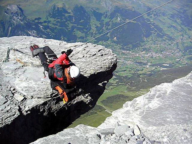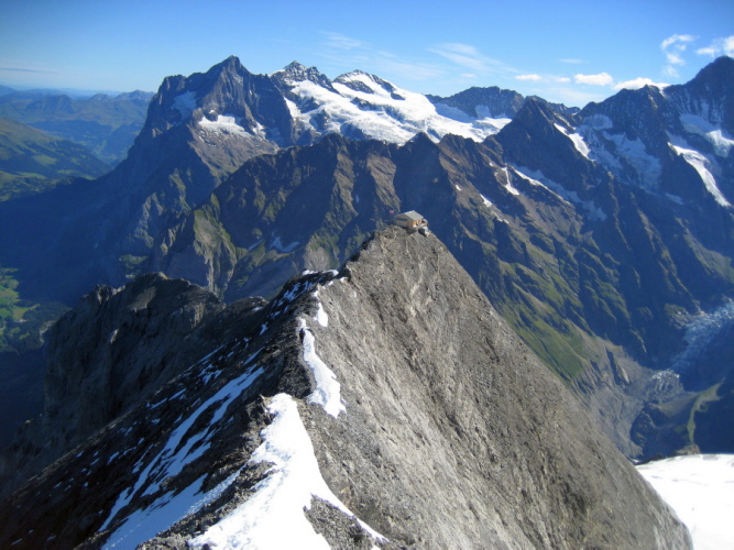 08/2010: Am Mittellegigrat des Eiger (3970 m); im Hintergrund die Mittellegihütte (3355 m)